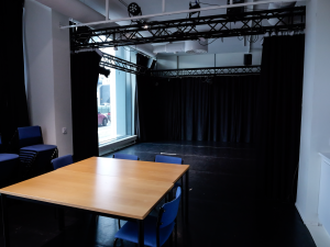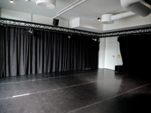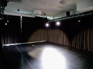 Repsal Busholmen is the size of 93m2, which approximately 60m2 is usable for rehearsals. In addition there is a small kitchen, toilet, shower and a small space for storing equipment. The rehearsal space is also equipped with molton curtains and stage technique.